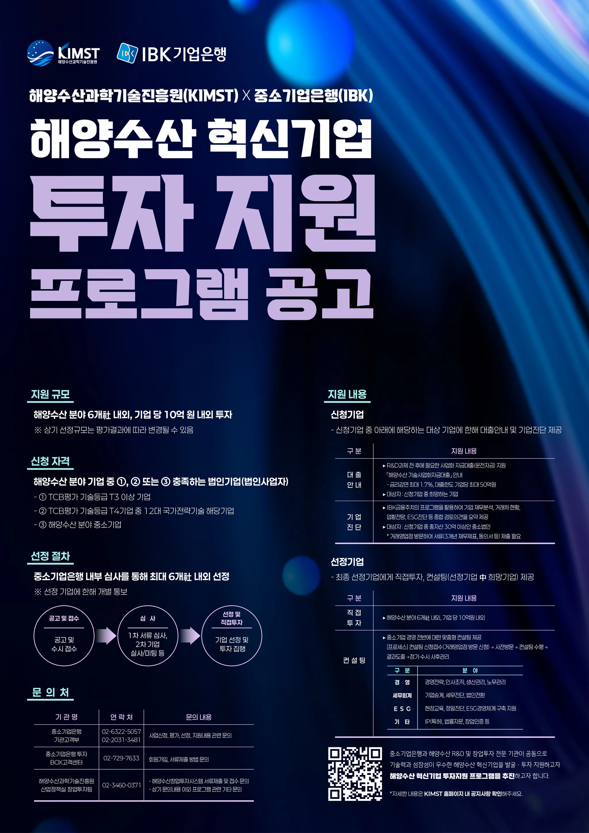 해양수산 경제와 산업의 성장 동력 확보를 위해 벤처 생태계의 자생적 성장기반인 벤처투자를 확대하고자 해양수산과학기술진흥원과 중소기업은행이 협업하여 해양수산 혁신기업 투자 지원 프로그램을 추진하고자 하오니 관심 있는 기업들의 많은 참여 바랍니다.