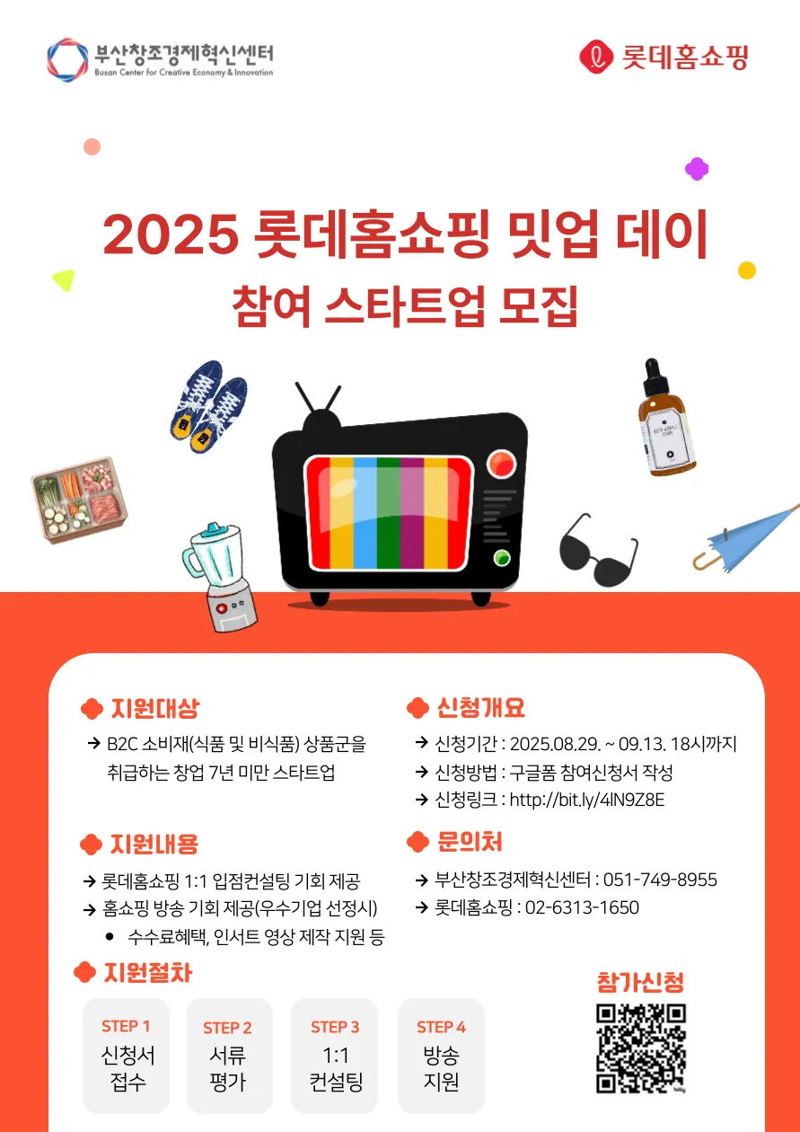 부산창조경제혁신센터에서는 TV 홈쇼핑 방송 진출을 희망하는 스타트업을 대상으로 롯데홈쇼핑과의 입점 상담을 통한 역량강화를 지원하고자 2025 롯데홈쇼핑 밋업 데이 행사를 아래와 같이 개최하오니 참가를 희망하시는 기업의 많은 신청 바랍니다.
