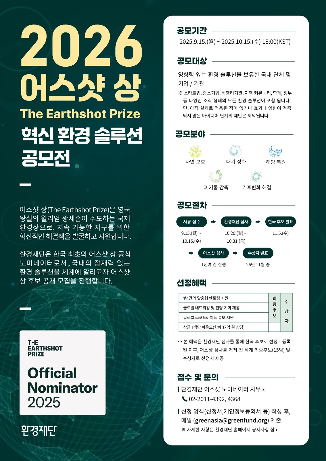 가. 공 모 명 : 2026 어스샷 상(The Earthshot Prize) 혁신 환경 솔루션 공모전