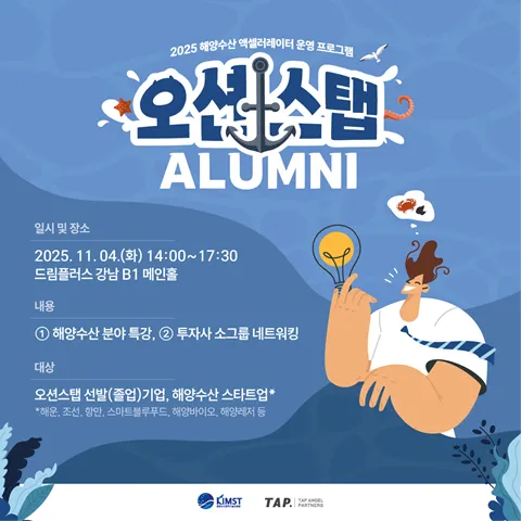 오션스탭 운영사무국에서 연말을 앞두고 해양수산 분야 스타트업과 선발(졸업)기업, 그리고 스타트업 대표님을 초청하여 특강과 네트워킹을 할 수 있는 자리를 마련하였습니다. 일정 가능하시다면 많은 관심과 참여를 부탁드리겠습니다.