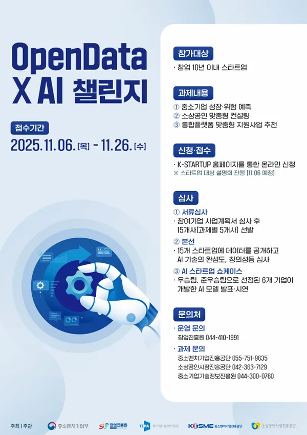 중소벤처기업진흥공단, 소상공인시장진흥공단, 중소기업기술정보진흥원현장데이터를 활용한 대국민 서비스혁신 AI솔루션 발굴을 위해OpenData X AI 챌린지를 운영하고자 합니다.이에 우수 AI 스타트업의 많은 지원과 관심 부탁드리며,자세한 사항은 모집 공고를 확인해주시기 바랍니다.☞ 모집공고 : https://www.k-startup.go.kr/web/contents/bizpbanc-ongoing.do?pbancClssCd=PBC010&schM=view&pbancSn=175386